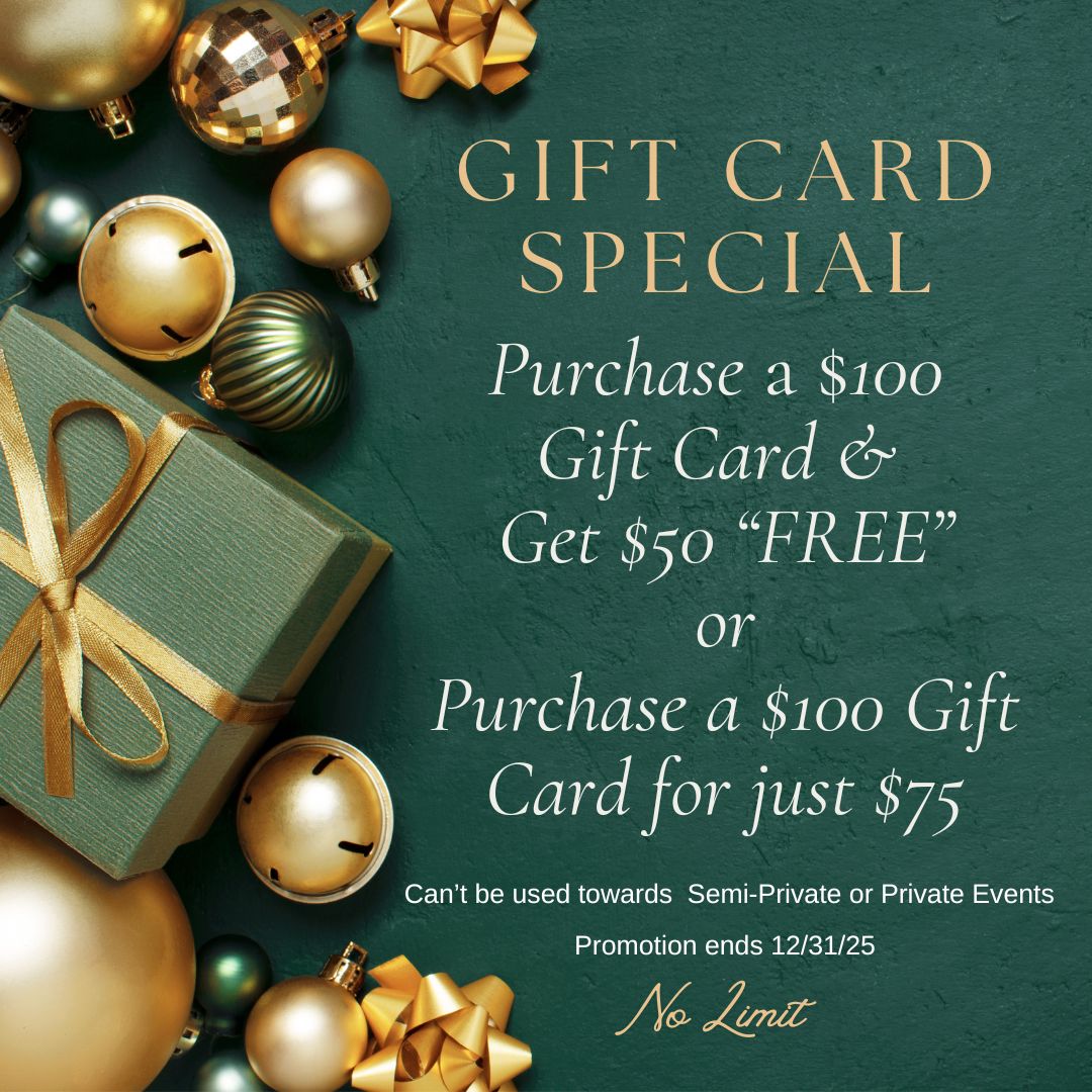 Celebrate the season with our Holiday Gift Card Promotion! Purchase a $100 gift card online and receive a $50 bonus gift card FREE, or give us a call or stop in to receive a $100 gift card for only $75. Stock up and save—there are no limits on the number of gift cards you can purchase! It’s the perfect gift for anyone on your list—simple, thoughtful, and always the right size. Whether you're treating loved ones or giving yourself a little extra, our gift cards make holiday gifting effortless and exciting.Must mention Promo Code: HOLIDAY GIFT Excludes semi-private and private events.